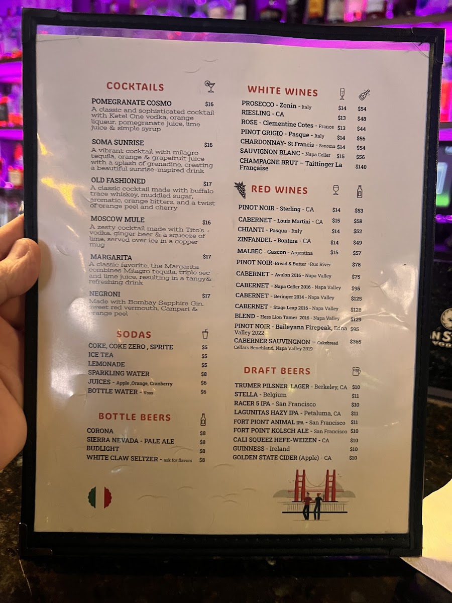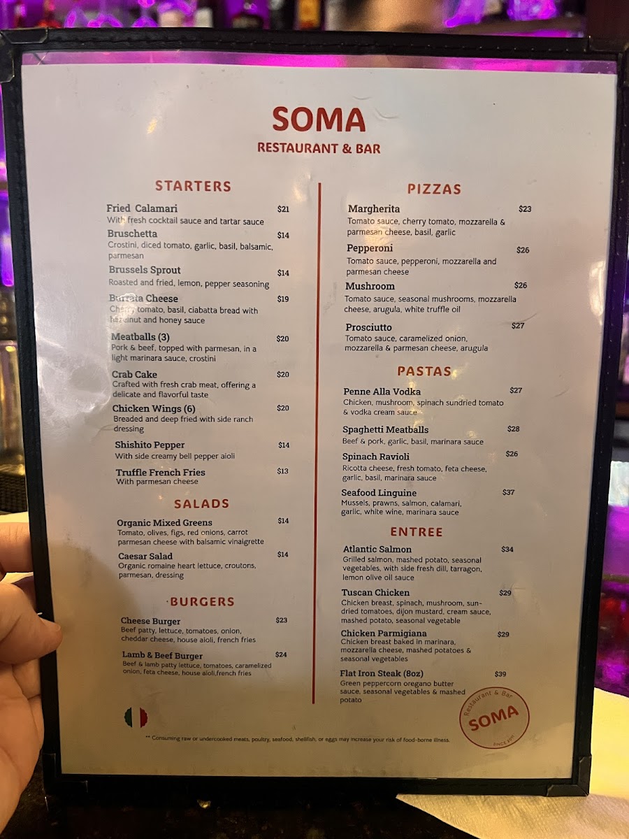 Soma Restaurant & Bar is a relaxed and welcoming spot in downtown San Francisco. It serves a mix of Italian-style dishes like pasta, pizza, and seafood, along with burgers and steaks, making it a great choice for a casual meal or drinks with friends. With its cozy vibe, full bar, and central location near Union Square, it’s a convenient go-to whether you’re exploring the city or just looking for a solid place to eat nearby.
